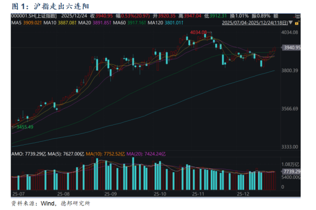 政策催化与产业景气共振下市场有望延续震荡上行。上证指数今日实现六连阳的连续反弹,市场超4100只个股上涨,显示市场情绪持续好转,我们认为未来政策催化与产业景气共振下市场有望延续震荡上行走势。中央经济工作会议强调“以科技创新引领现代化产业体系建设”,商业航天、人工智能、半导体等被列为重点发展领域,政策支持力度持续加码下,近期以商业航天为代表的板块热度持续提升。美联储12月降息落地后,近期人民币持续升值,美元兑离岸人民币指数今日下跌逼近7关口,或推动人民币资产吸引力提升,外资未来对A股市场配置有望进一步提升。