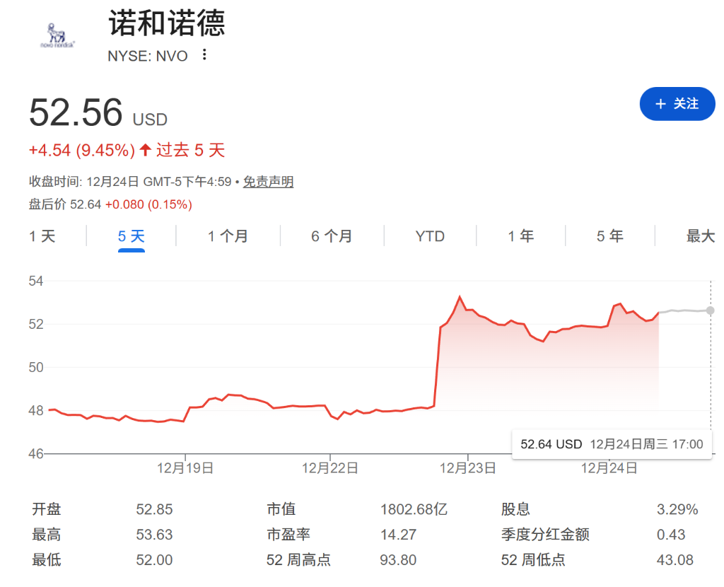 受此消息提振,诺和诺德股价在近期交易中反弹超过9%。