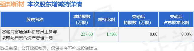 证券之星消息,12月25日强邦新材发布公告《强邦新材:关于减持计划实施进展公告》,其股东富诚海富通强邦新材员工参与战略配售集合资产管理计划于2025年11月18日至2025年12月24日间合计减持237.6万股,占公司目前总股本的1.485%,变动期间该股股价下跌10.4%,截止12月24日收盘报34.21元。