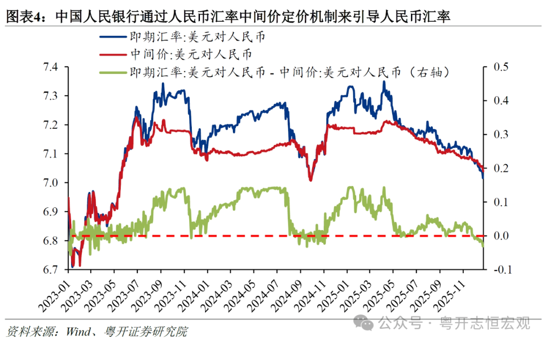 四是中国人民银行为保持人民币对一篮子货币汇率稳定,引导人民币对美元汇率合理有序升值。特朗普对华大幅加征关税,在导致美元指数下降的同时,也对人民币带来了较大贬值压力。中国人民银行使用逆周期因子,对人民币汇率中间价进行调节,引导市场汇率向偏强侧运行。2025年1-4月,人民币汇率贬值压力较大,逆周期因子加强,体现为人民币对美元即期汇率与中间价的大幅偏离,人民币对美元汇率保持相对稳定。随着中国对美坚决反制、中国出口保持强劲韧性、中国股市走强,人民币贬值压力减轻,逆周期因子调节力度减弱。但为保持人民币对一篮子货币汇率稳定,中国人民银行仍引导人民币汇率适度升值,人民币对美元汇率在市场和政策共同作用下持续走强,由4月9日的7.35持续升至破7。12月8日以来,人民币对美元即期汇率持续强于中间价,反映出中国人民银行在防范人民币汇率过快升值。