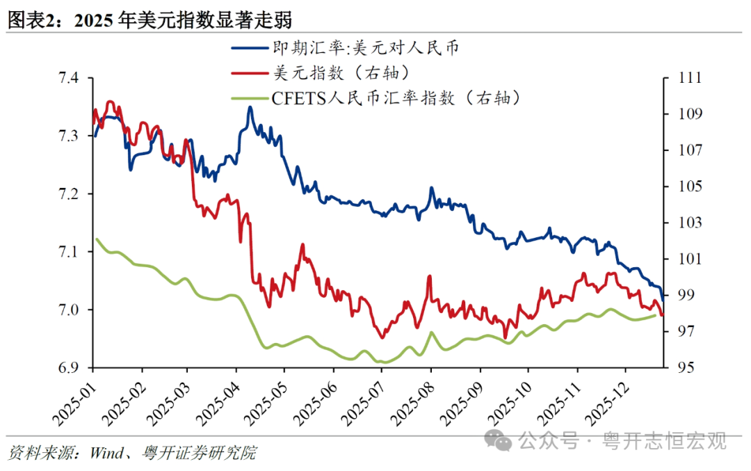 1、2025年人民币对美元汇率显著走强,尤其是11月下旬以来呈加速升值态势,但人民币对一篮子货币汇率仍小幅贬值。截至12月24日,2025年人民币对美元汇率升值4%,但美元指数下跌9.7%,表明美元贬值是人民币对美元汇率升值的主要原因。截至12月19日,人民币对一篮子货币汇率的CFETS人民币汇率指数下降3.5%,反映出人民币对非美货币总体贬值。