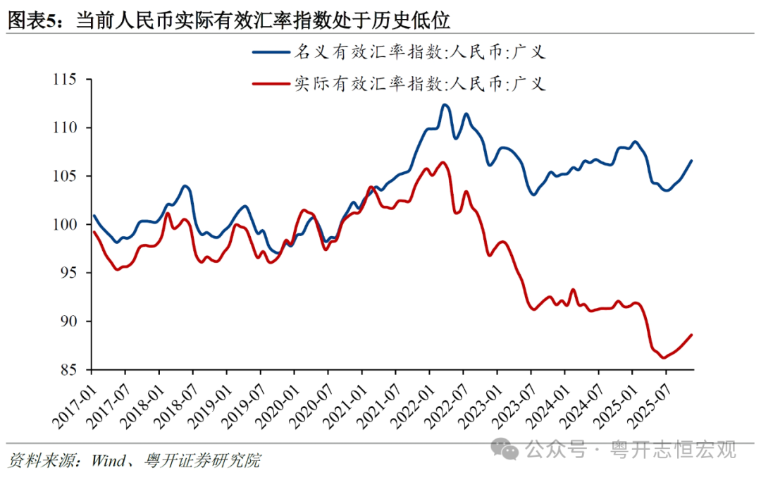 2024-2025年,人民币名义有效汇率指数高于疫情前水平,但由于国内物价持续低迷、海外通胀高企,人民币实际有效汇率显著低于疫情前水平。因此近两年中国出口保持较高增速,除了中国出口相关产业本身强大的国际竞争力以外,人民币实际有效汇率较低也是重要助力。