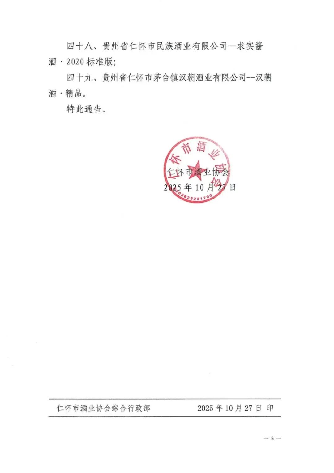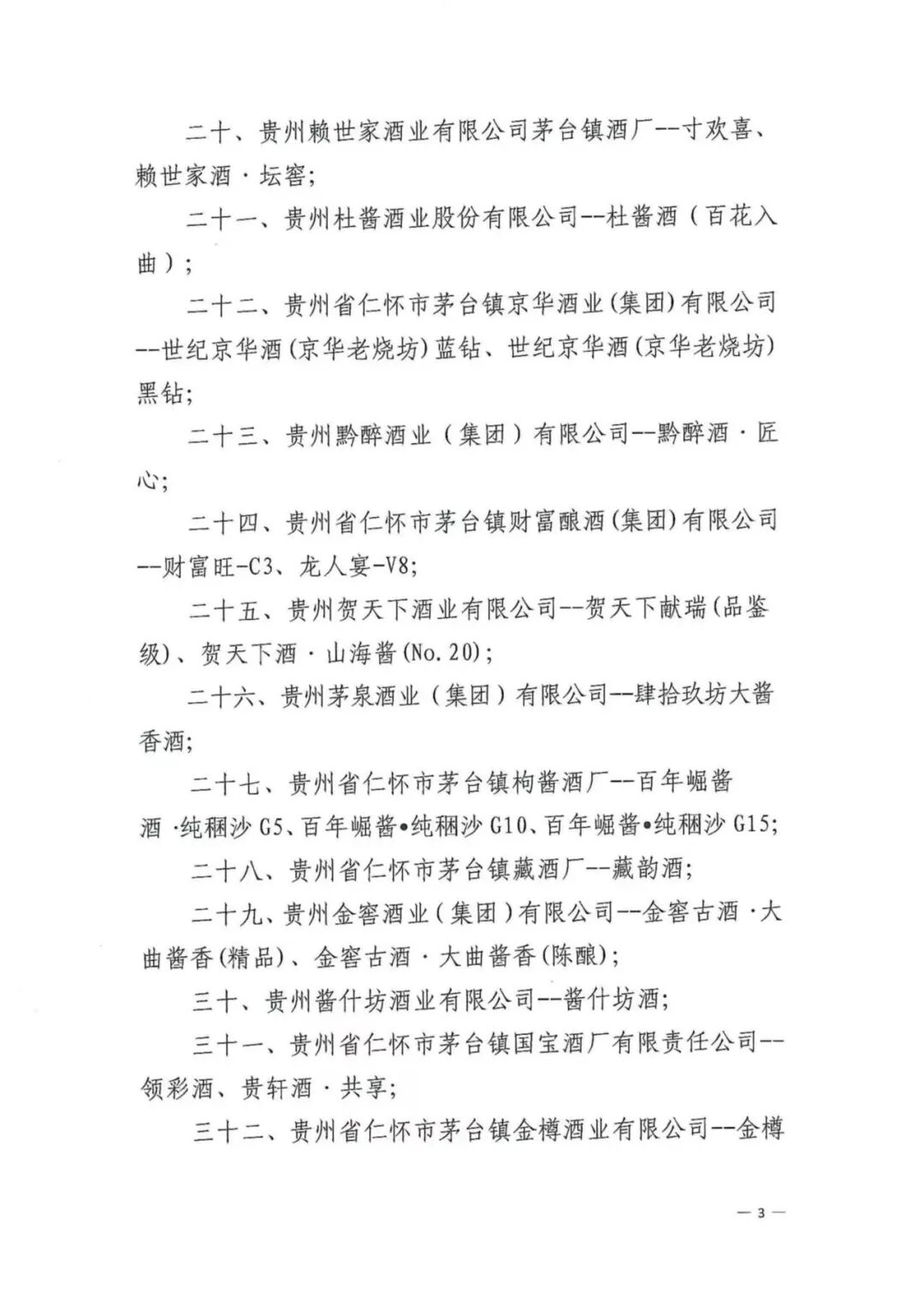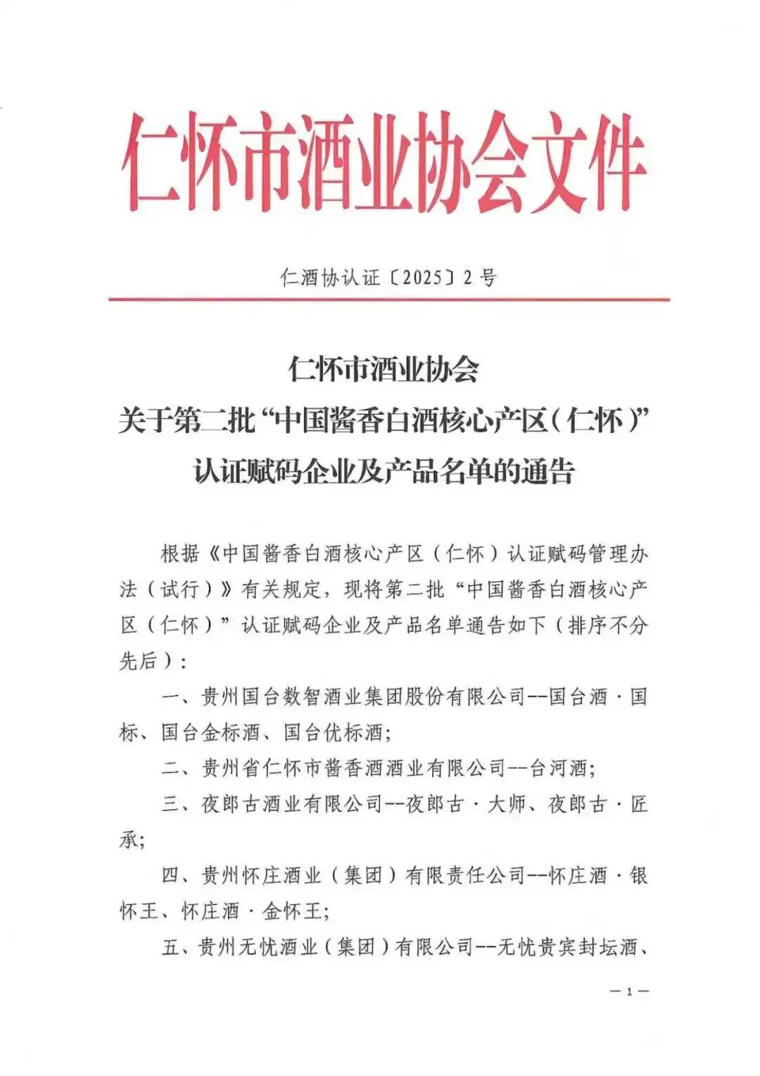 12月26日,据仁怀酒协微信公众号消息,根据《中国酱香白酒核心产区(仁怀)认证赋码管理办法(试行)》有关规定,现公布第二批“中国酱香白酒核心产区(仁怀)”认证赋码企业及产品名单,共有贵州国台数智酒业集团股份有限公司--国台酒·国标、国台金标酒、国台优标酒,贵州省仁怀市酱香酒酒业有限公司--台河酒,夜郎古酒业有限公司--夜郎古·大师、夜郎古·匠承等49家企业在列(排序不分先后,该通告已于10月份书面印发,此次应读者要求在官微公开发布)。具体名单如下: