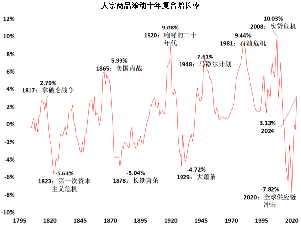 注:数据来源Warren&Pearson Commodity Index(1795-1889),BLS WPI Commodities Index(1890-1968),FRED All Commodities Producer Price by Commodity(1969-1993),RJ/CRB Commodity Index(1994-2024),雅各布﹒范杜因《创新随时间的波动》,周金涛《涛动周期论》,Joseph A.Schumpeter. Bussiness Cycles: A Theoretical, Historical and Statistical Analysis of the Capitalist Process, 1939:P211,历史过往仅供参考,不预示未来表现。