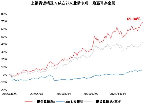 权益产品业绩当然最重要。以数据参考,产品A类份额成立以来累计收益率达69.04%,远胜现货金属价格及业绩比较基准,在年内可谓表现亮眼。(注:数据来源见下)