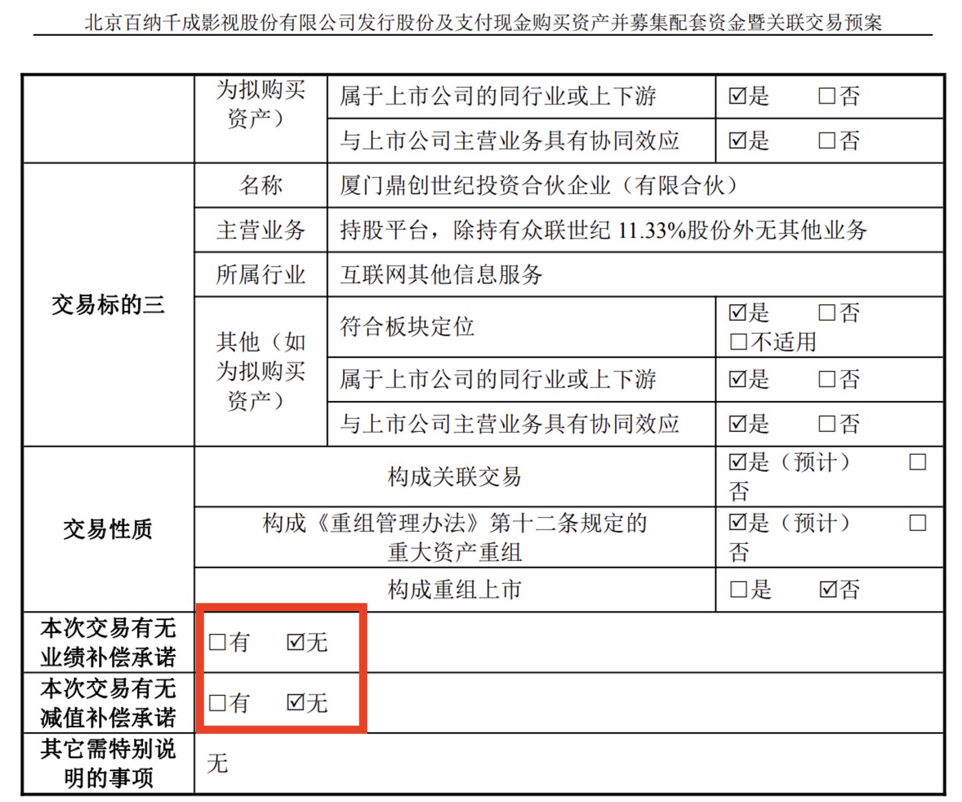 百纳千成将通过发行股份及支付现金方式收购众联世纪100%股权,该笔收购将分为三个部分,包含一笔直接收购和两笔间接收购,预计构成重大资产重组。为此次并购,百纳千成还将同步募集配套资金,但并购交易不以募资为前提。