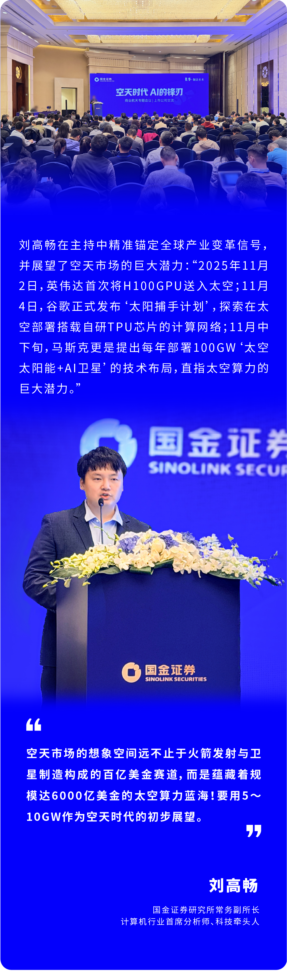 会议由国金证券研究所常务副所长、计算机行业首席分析师、科技牵头人刘高畅主持。刘高畅团队凭借深厚的行业洞察力,曾连续5年斩获新财富计算机行业第1名,且于2025年11月下旬便敏锐捕捉产业趋势,坚定且深入地向市场推荐商业航天相关产业机会。