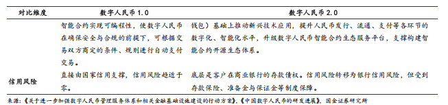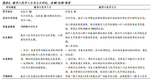 1)属性方面,在 1.0 阶段,其定位遵循现钞属性,作为不计息的法定数字货币,主要承担支付职能。而《行动方案》的推出,标志着数字人民币迈入 2.0 存款时代。银行机构为客户实名数字人民币钱包余额计付利息,并纳入存款利率定价自律机制;同时,银行类数字人民币业务运营机构的数字人民币纳入准备金制度框架管理,其开立的数字人民币钱包余额统一计入存款准备金交存基数,参与数字人民币运营的非银行支付机构实施 100%的数字人民币保证金。这一系列安排,数字人民币在货币统计上归属于 M1,在制度层面深度融合至传统信用货币创造与管控体系。