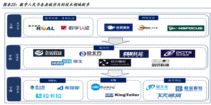 场景层:数字人民币在应用时,交易过程中的环节会涉及 POS 机、ATM 机等支付终端设备的升级,以及数字钱包的使用。非银领域的主要企业包括拉卡拉、新大陆、新国都等。