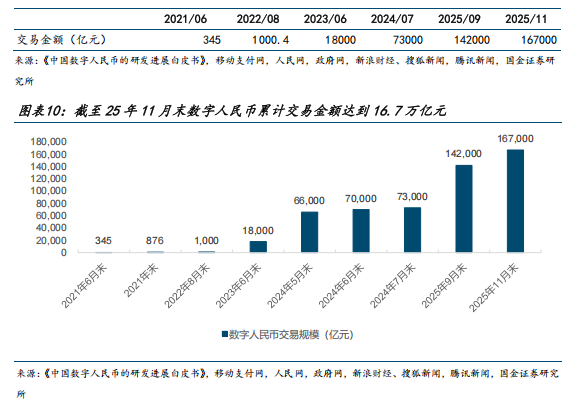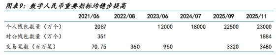 从数字人民币应用数据来看,截至 2025 年 11 月末,数字人民币累计处理交易 34.8 亿笔,累计交易金额 16.7 万亿元。通过数字人民币 APP 开立个人钱包 2.3 亿个,数字人民币单位钱包已开立 1884 万个。