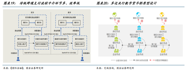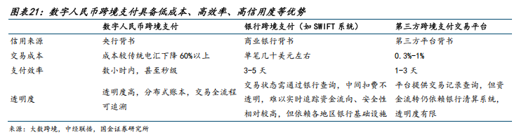 数字人民币跨境支付领域大有可为,过往采用传统电汇模式较多的大宗等商品交易可使用mBridge 降本增效。传统跨境支付面临中介环节多、成本高、效率低等难题,而多边央行数字货币桥(mBridge)可以解决这些问题。mBridge 是由国际清算银行(香港)创新中心、泰国中央银行、阿联酋中央银行、中国人民银行数字货币研究所和香港金融管理局于 2021年 2 月联合发起的跨境支付基础设施,基于分布式账本技术构建,实现多方点对点直接交互,减少了传统跨境支付模式对 SWIFT 和代理银行的依赖,使跨境支付结算时间从 3-5天缩短至 6-9 秒,成本显著降低。mBridge 平台基于各国央行数字货币的信用背书,也解决了传统跨境支付缺乏信用节点的问题。截至 2025 年 11 月末,多边央行数字货币桥累计处理跨境支付业务 4047 笔,累计交易金额折合人民币 3872 亿元,其中数字人民币在各币种交易额占比约 95.3%。