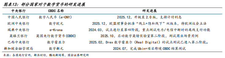 动力充足:1)加密货币、全球性稳定币等虚拟货币可能给国际货币体系、支付清算体系、货币政策、跨境资本流动管理等带来诸多风险和挑战,因此发展主权货币的数字货币有必要性。2)根据智通财经报道,全球共有 130 个国家(占全球经济总量的 98%)正在探索本国货币的数字版本,其中近一半处于高级开发、试点或启动阶段。“十五五”规划中提及“加快建设金融强国”、“稳步发展数字人民币”,作为国家金融基础设施,数字人民币有望优化货币政策传导效率、助力人民币国际化进程,获得更多国际金融话语权。