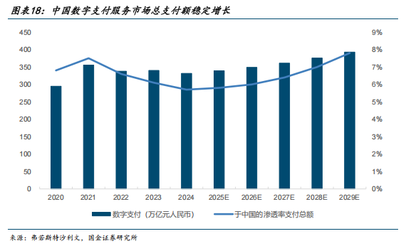 境内外均有广泛的应用场景,数字支付规模将持续增长。根据《现代金融导刊》,数字人民币在境内的零售支付、普惠金融、公共财政及金融市场创新等领域拥有广阔应用空间。在跨境层面,数字人民币凭借其制度与技术优势,在大额结算、国际合作及人民币国际化等领域展现出巨大的应用潜力。根据弗若斯特沙利文预测,2024 年我国数字支付市场的总支付额为 332 万亿元,到 2029 年有望达到 393 万亿元,2025 至 2029 年复合增速为 4%。