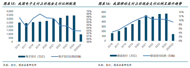 我国有合适的利于数字人民币“生长”的“土壤”。我国现金使用率较低,电子支付已成习惯,根据央行披露,我国在非现金支付额中电子支付率维持在 60%以上。2013 年,阿里与腾讯在移动支付端展开竞争,推动了移动支付规模及占比的提高。根据央行披露,我国移动支付占非现金支付规模比例从 2016 年的 4.27%提升至 25Q3 的 9.15%。