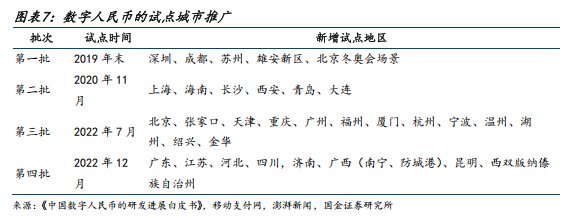 数字人民币试点范围的拓展体现了“稳妥推进、有序扩围”的渐进式发展策略。2019 年末以来数字人民币首批试点在深圳、苏州、雄安新区、成都及 2022 北京冬奥会场景启动,以检验理论可靠性、系统稳定性、功能可用性、流程便捷性、场景适用性和风险可控性。2020 年 11 月开始,试点进一步扩展至上海、海南、长沙、西安、青岛、大连等城市。2022年,数字人民币试点区域陆续新增天津、重庆、广州、福州、厦门及浙江省承办亚运会的6 个城市,并广泛接入京东、美团等互联网平台。截至目前,数字人民币试点已历经多轮有序扩展,覆盖全国 17 个省(市)的 26 个地区,逐步形成广覆盖的试点网络。数字人民币研发试点地区的选择综合考虑了国家重大发展战略、区域协调发展战略以及各地产业和经济特点等因素,目前的试点省市基本涵盖华东、华中、华南、西南、西北、东北、华北等不同地区,有利于试验评估数字人民币在我国不同区域的应用前景。