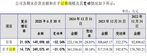 尽管近年来营业收入和净利润持续增长,但公司在手订单却出现下降。报告期各期末,公司在手订单规模分别为17.67亿元、51.75亿元、36.13亿元和24.91亿元,复合增长率为14.72%,与存货增长趋势接近。江松科技在其招股书中解释,受光伏产能加速出清影响,2024年末公司在手订单有所下滑。