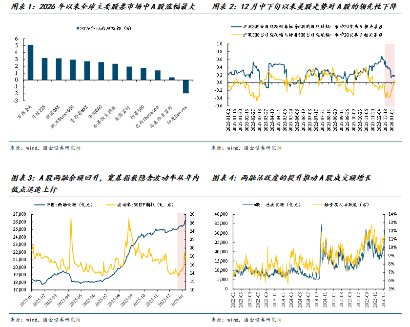 进入2026年以来,A股涨幅相比于全球其他主要股票市场的涨幅明显更高,上证指数实现16连阳,万得全A指数在此期间上涨9.8%,成交额放量超35%。本轮A股上行行情开始于2025年12月中下旬,市场流动性的改善是驱动上涨的直接催化因素:在上证16连阳期间,A股融资融券余额增长超1250亿元,融资买入占全A成交额比例也有明显回升,带动全A成交额于本周五再次突破3万亿元,以上证50为代表的宽基指数期权隐含波动率也从过去一年低点的15%快速回升至18%附近。最近半个月以来,美股前日涨跌幅与A股当日涨跌幅之间的相关性明显回落,去年11月以来至12月中上旬A股跟随美股变动的情况也出现了转变。