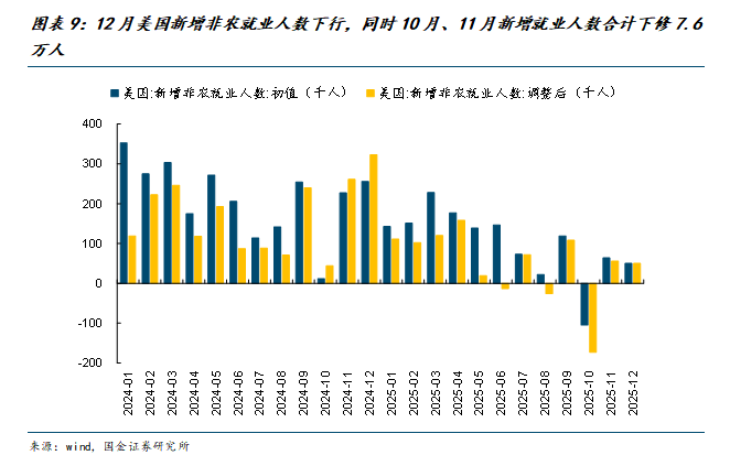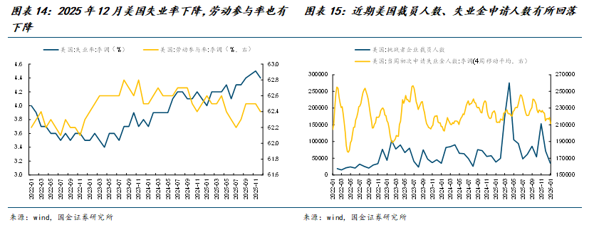 尽管就业市场存在压力,但这并不意味着美国经济处在衰退的边缘,AI对就业市场的影响更多体现为压低新增就业的增长。12月美国失业率有所下降,部分原因在于劳动参与率有所下降,同时也需要注意到当前美国就业市场的裁员压力并不大,近期首次申请失业金人数趋于下降,同时企业裁员数也处在近年来相对较低的水平。