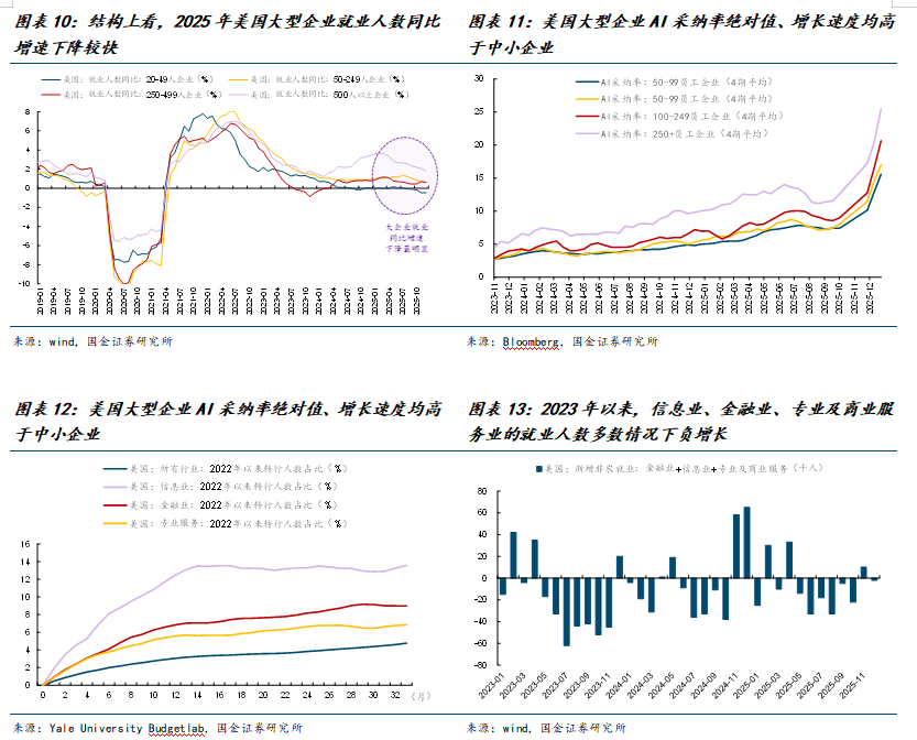 当前美国就业市场的仍然存在较大压力,本周公布的12月新增非农就业5万人,低于市场预期水平;同时10月、11月的新增就业人数合计下修7.6万人。从结构上看,AI对新增就业的抑制性作用仍然明显:2025年以来,美国500人以上大企业就业人数同比增速的下降幅度显著高于中小企业,与之相对应的是过去一年中美国大企业的AI采用率与中小企业相比要更高且增长速度更快。从过去经验来看,美国信息业、金融业、商业与专业服务业可能是受AI冲击最大的三个行业,2022年以来这3个行业的转行人数占比大幅高于美国整体就业市场中转行人数的占比。对应到非农就业数据来看,2023年以来上述3个行业的新增非农就业人数在多数时间内出现负增长,新增就业累计减少34.4万人。