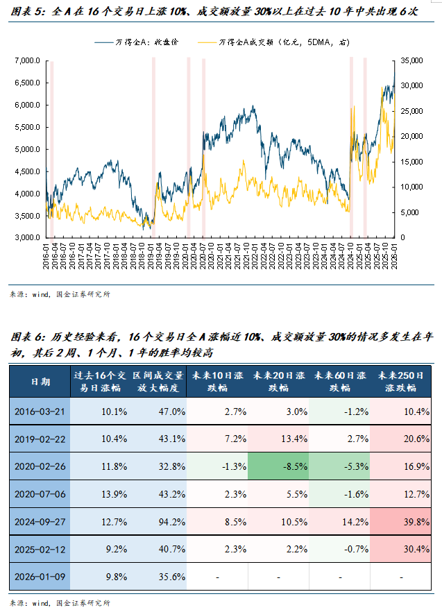 类似于当前A股市场特征的情况在年初的市场行情中并不鲜见。如果以万得全A在16个交易日内上涨幅度接近或超过10%、全A成交额扩张幅度超过30%为标准进行筛选的话,过去10年中共有6次类似的情况出现,分别是2016年3月、2019年2月、2020年2月、2020年7月、2024年9月以及2025年2月。其中2016、2019、2020和2025年的年初行情都出现过类似的情况。从过往经验来看,在上述6次A股市场出现成交额大幅放量且股市有明显的阶段性上涨之后,其后10个交易日、20个交易日及250个交易日内万得全A指数的表现普遍有较高的胜率。
