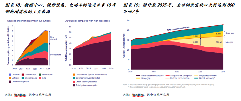 一是以AI、新能源为代表的新产业出现对相关资源品需求的潜在拉动很大,进而扩大相关商品的供需缺口。以铜为例,根据麦肯锡的测算,数据中心建设、可再生能源设施建设以及新能源车制造等新兴产业是未来10年需求增长的主要来源,预计到2035年时全球铜的年需求量将达到约5000万吨;而基于当前铜产量情况及在建项目测算,到2035年时铜的供需缺口将超过800万吨。