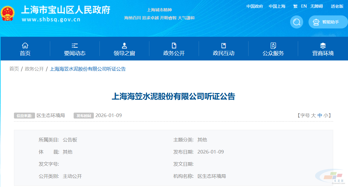 1月9日,上海市宝山区生态环境局发布关于上海海笠水泥股份有限公司听证的公告。