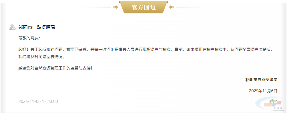 祁阳县受影响民营企业代表群体表示其于2025年9月17日首次反映该问题,指出海螺水泥将按规定仅限自用的矿区块石,通过关联交易对外销售,严重冲击本地市场。2025年9月29日,祁阳市自然资源局回复认定其销售石料为“外购所得”,不适用矿产监管。2025年10月22日,民营企业代表群体又再次进行书面汇报诉求,但始终未得到答复。