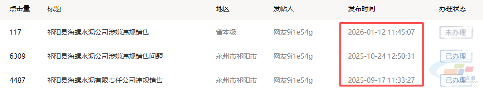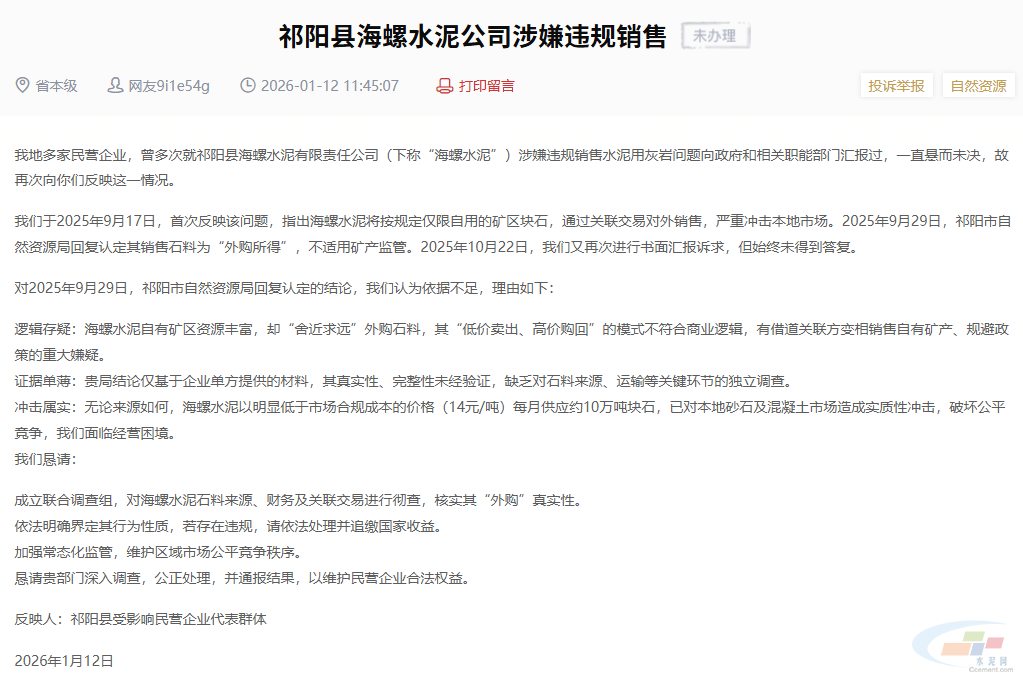 据“百姓呼声”网站信息显示,湖南省祁阳县多家民营企业代表群体于2026年1月12日,就祁阳县海螺水泥有限责任公司(下称 “祁阳海螺水泥”)涉嫌违规销售水泥用灰岩问题再次向相关部门反映。