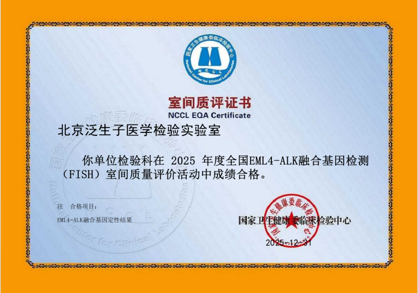 满分通过NCCL全国EML4-ALK融合基因检测(FISH)室间质评