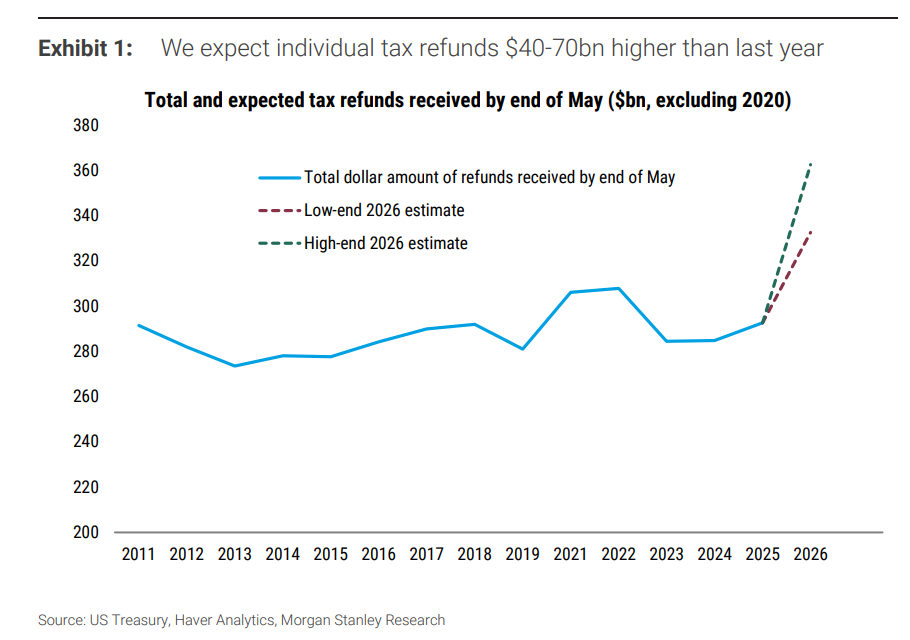 关键数据: 摩根士丹利预计,今年的个人退税额将比去年高出400亿至700亿美元。如果收到退税的消费者数量保持不变,平均退税规模将增加550美元,达到约3500美元的历史高位。