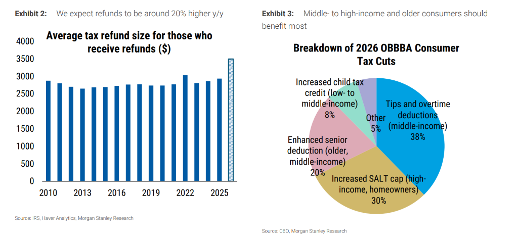 收入预期: 摩根士丹利预计,受退税和预扣税降低的推动,2026年第一季度实际可支配个人收入将年化环比增长4.1%,彻底扭转2025年下半年的持平走势。