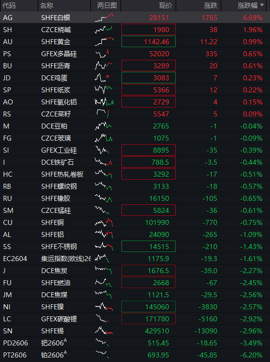 商品:国内商品期货多数下跌,截至发稿,沪银逆势涨6%,烧碱涨2%,沪金、多晶硅、沥青、鸡蛋、纸浆、氧化铝、菜籽等小幅上涨,豆粕、玻璃、工业硅、铁矿石、热轧卷板、螺纹钢、橡胶、锰硅、沪铜等品种下跌,沪铝、不锈钢,集运指数跌超1%,焦炭、焦煤、燃油、沪镍、沪锡、碳酸锂跌超2%,钯金跌超3%,铂金跌超6%。