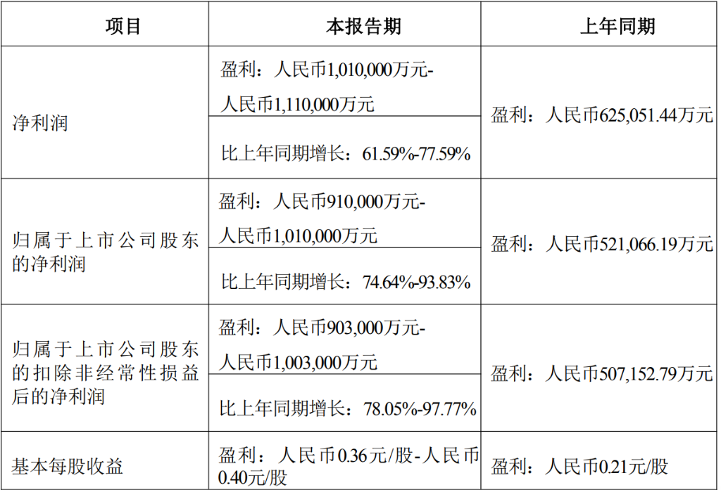 归母净利润91-101亿元,同比增长74.64%-93.83%;