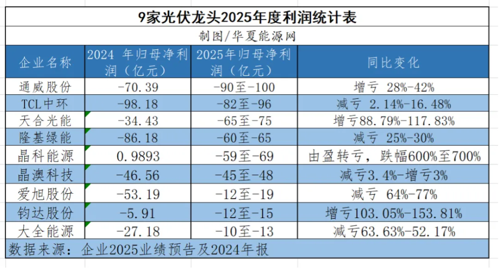 根据华夏能源网统计,发布业绩预报的9家光伏龙头中,通威股份以惊人的90亿-100亿元的预亏成为2025年的“亏损王”。按预亏额度高低排序,TCL中环、天合光能、隆基绿能、晶科能源分别名列第二、第三、第四和第五。其中晶科的亏损最为惊人:2024年大家都亏时,它还盈利了9893万元,2025年却预亏59-69亿元,同比降幅600%-700%。