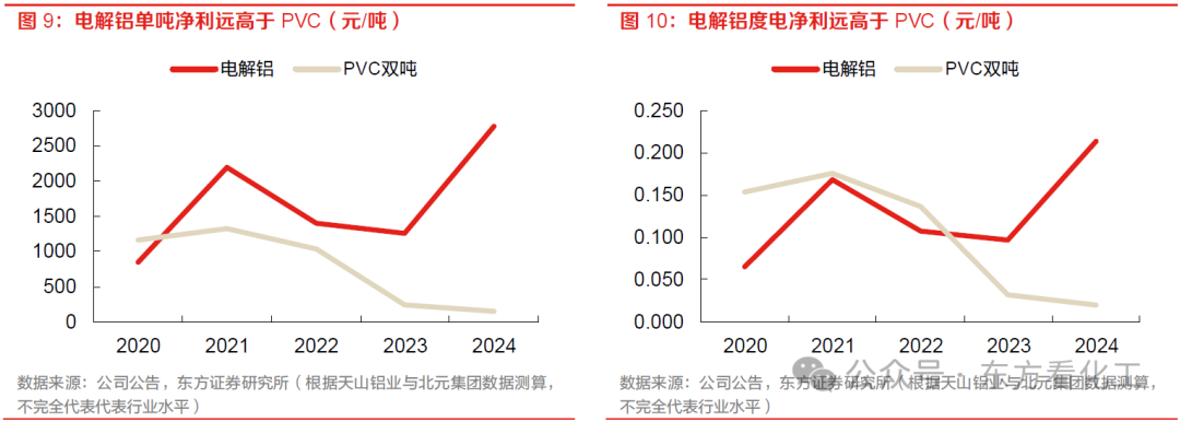 根据上文分析,我们认为在需求结构转变、供给难以扩张的情况下,电石法PVC的投资回报率有望向电解铝靠拢。而这一投资回报率应当以最核心的生产要素电力来作为指标。我们以主业相对集中,区位也比较靠近的天山铝业和北元集团作为样本。我们选取天山铝业作为电解铝企业样本,主要由于其电解铝生产所用氧化铝主要来自外购,因此其电解铝情况能够较好表现氧化铝-电解铝单一环节的盈利情况。另外,北元集团PVC产能110万吨,电石产能50万吨,还需要外购100万吨以上电石用于PVC生产。因此2021-2022年,国内电石价格因双碳政策大幅上涨时,北元集团盈利能力相对产业链配套更完整的PVC企业来说偏低。