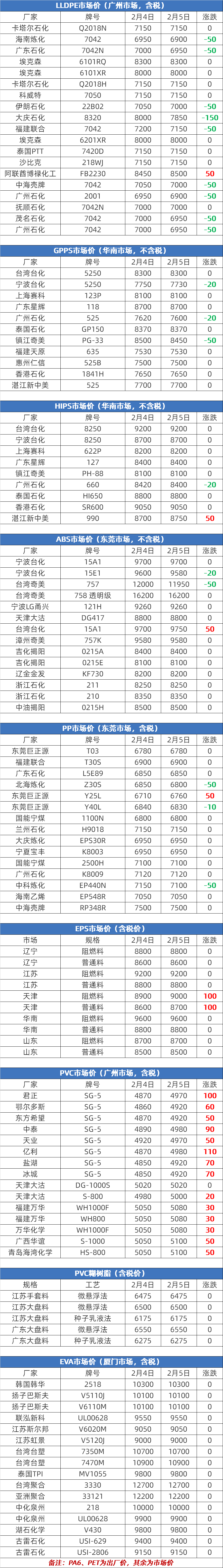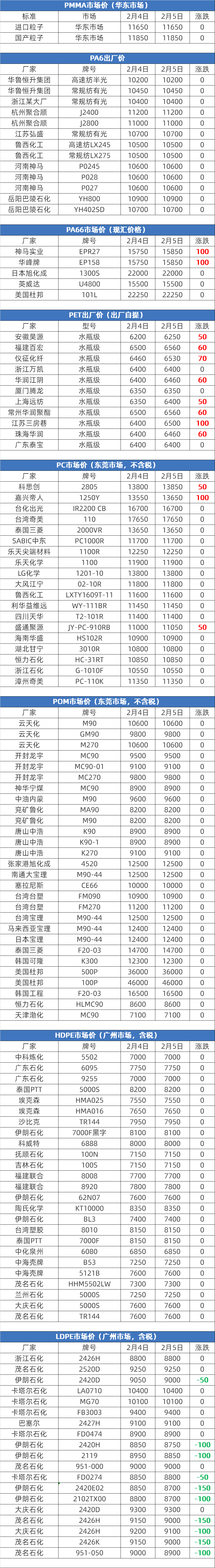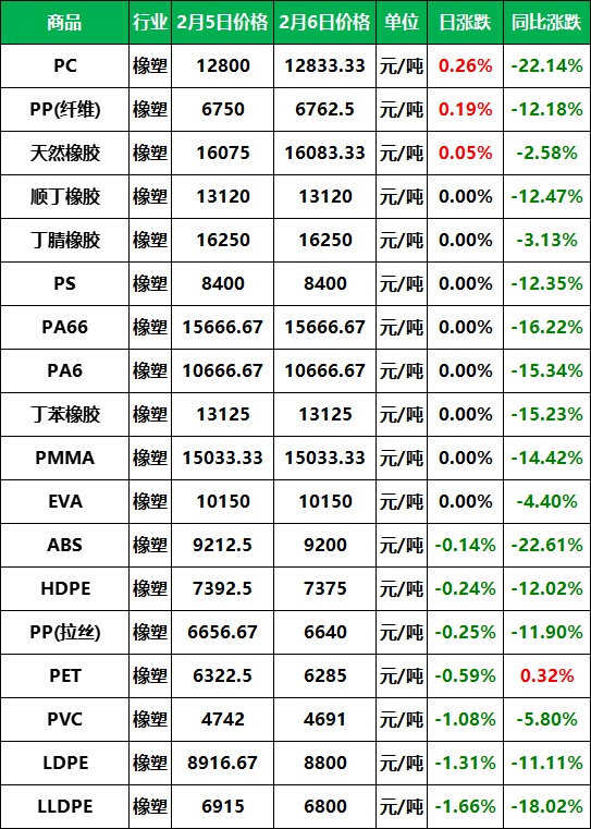 2026年2月6日大宗商品价格涨跌榜中橡塑板块环比上升的商品共3种,涨幅前3的商品分别为PC(0.26%)、PP(纤维)(0.19%)、天然橡胶(0.05%)。