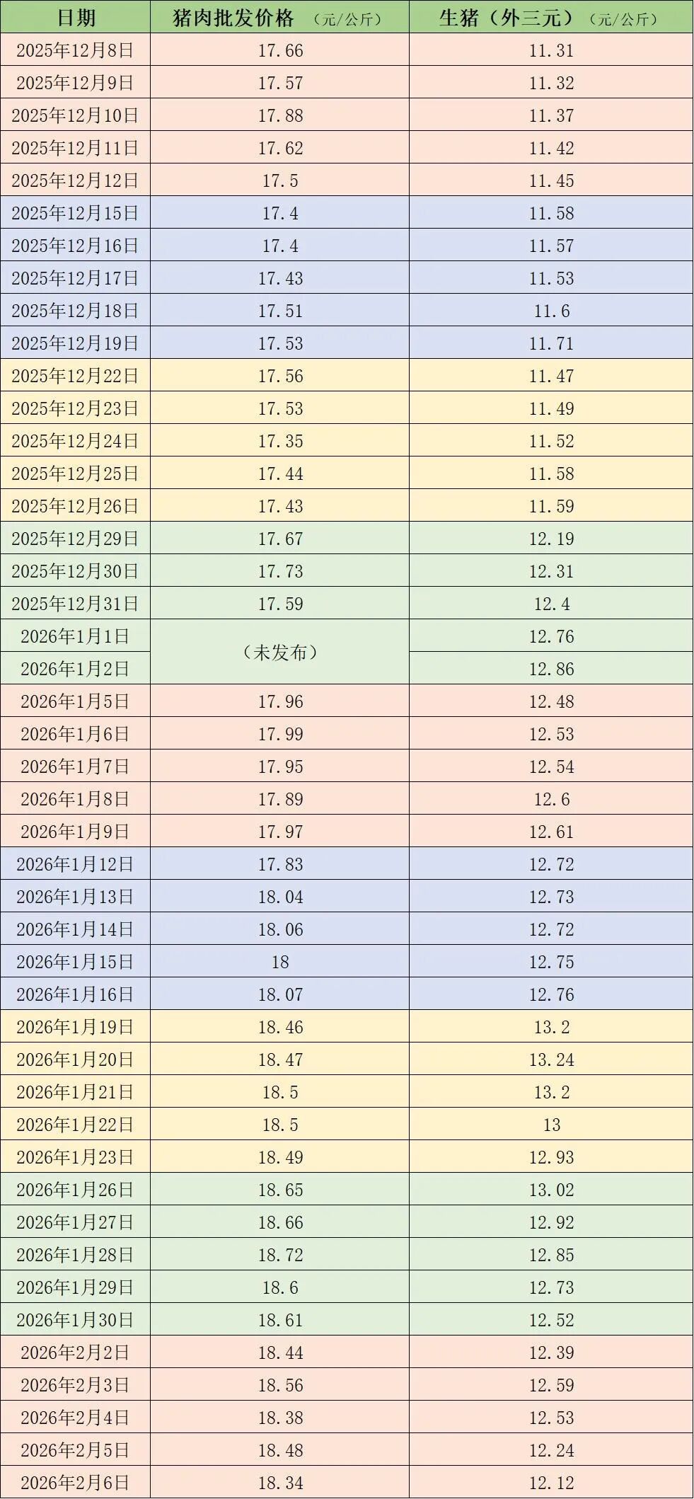 本周国内生猪价格整体呈先涨后跌走势,周均价环比下跌。2月6日,生猪(外三元)价格为12.12元/公斤,与上周五(1月30日)的12.52元/公斤相比,下降3.2%。从一周均价来看,本周生猪均价为12.37元/公斤,与上周12.81元/公斤的均价相比,下降3.4%。