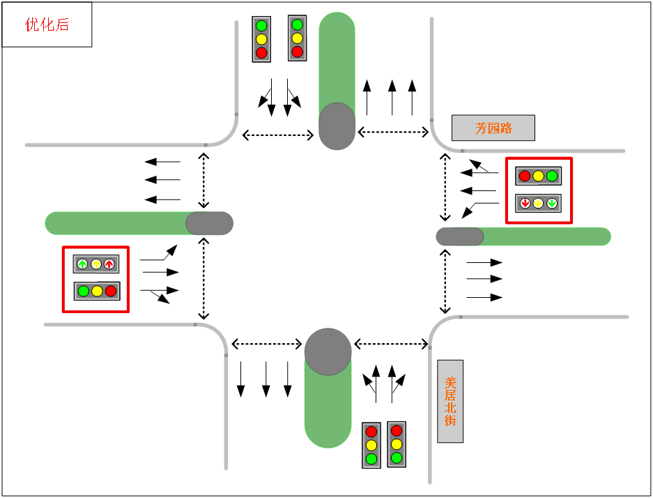 升级信号设施:针对芳园路沿线路口主向车流集中的特征,将四个路口东西进口,由全屏灯控制模式升级为“全屏灯+左转箭头灯”组合控制,实现左转与直行交通流分离,为实现东西直行同步放行打下基础,大幅提升信号控制灵活性。