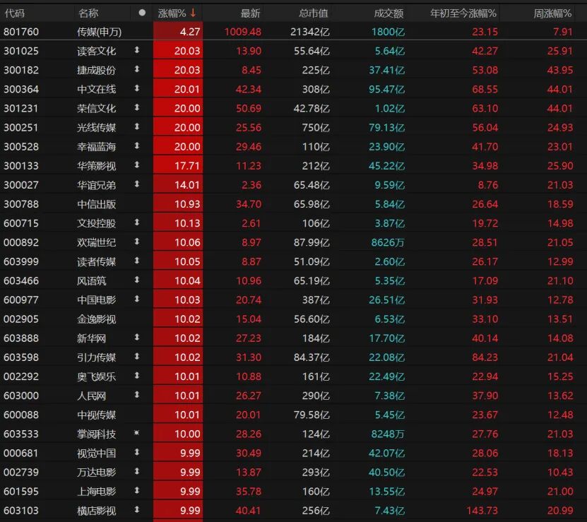 传媒板块大涨,27只相关个股涨停,读客文化、捷成股份、荣信文化、幸福蓝海等个股“20cm”涨停。