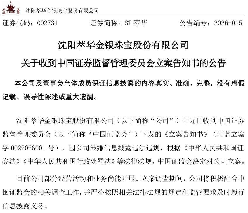 就在被实施ST前一晚,萃华珠宝披露,公司收到中国证监会下发的《立案告知书》。因涉嫌信息披露违法违规,中国证监会决定对其立案。