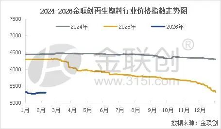 进入本周,传统春节前的最后一个交易周,当传统的备货喧闹归于沉寂,再生塑料市场呈现出一幅“静默”图景。报价数日未变,全国主要集散地门可罗雀。截至2月9日,金联创再生塑料行业价格指数收于5298点,较1月底持平。这种表面的价格稳定,实质是交易活动归零导致的“技术性停牌”。报价因缺乏任何成交验证而失去意义,市场流动性已降至年度冰点,是产业链各环节同步、彻底地按下暂停键的结果。