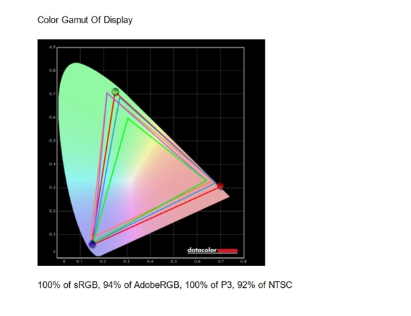 色域方面,这块屏幕达到了100% DCI-P3色域覆盖,94% AdobeRGB色域覆盖,是一块素质极高的广色域OLED屏幕。