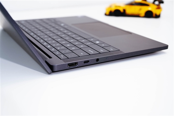 位于空格键正下方的触控板面积足够大,灵敏度、定位精确度极佳,因此操控体验出色。左右两侧腕托面积宽大,正手位打字整个手腕放上去能获得很好的承托感。此外,键盘两侧的扬声器配合底部双扬声器,共同营造出更立体的声场表现,让在线会议中的人声听感更加清晰自然。