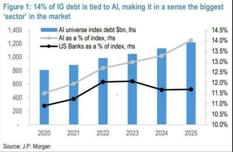 截至2025年底,AI相关的投资级债务已占美国IG市场的14%,成为市场中最大的单一主题板块,规模超过银行业。