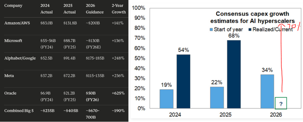 真正引发市场震动的,并不是单家公司“多花了钱”,而是整个超大规模云厂商体系的资本开支同时失控。这不是一次普通的资本支出上调,而是一次结构性跃迁。