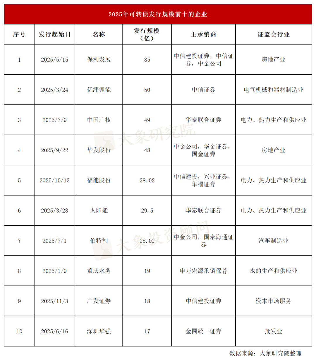 从发行规模来看,可转债发行规模最高的是保利发展(85亿),其次是亿纬锂能(50亿),第三是中国广核(49亿)。