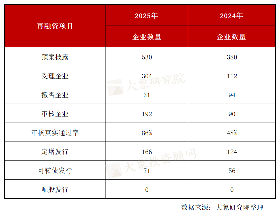 据统计,2025年A股再融资预案披露、受理、审核、发行上市的企业数量较2024年均增加,撤否企业减少63家,再融资审核通过率为86%,发行数量(定增发行、可转债、配股)比2024年略增加。