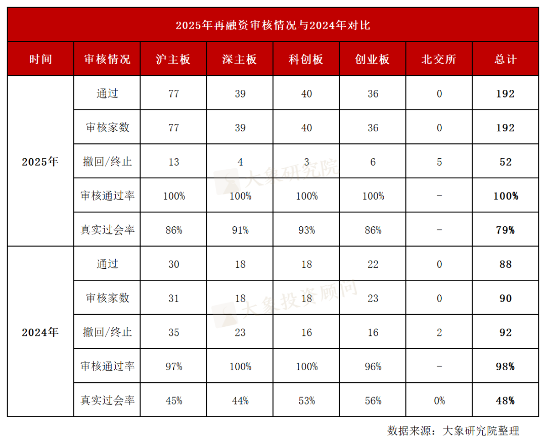 据统计,2025年A股再融资市场共计审核192家,较2024年的90家增加102家。真实审核通过率也由2024年的48%增加至79%。