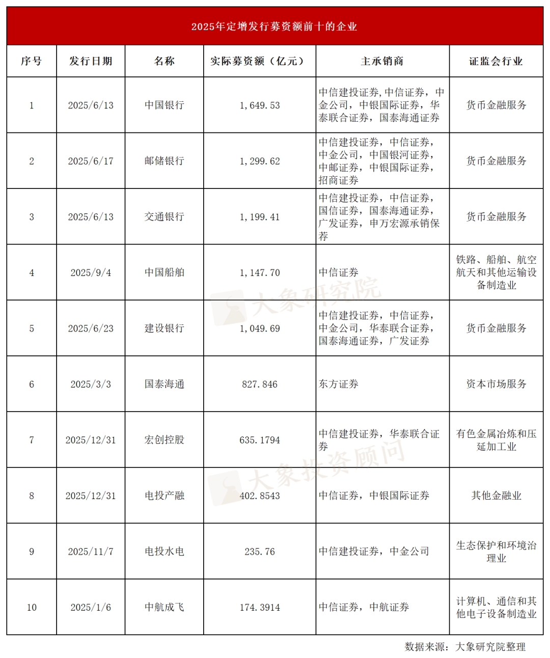 从募资额来看,定增募资额最高的是中国银行(1649.53亿),其次是邮储银行(1299.62亿),第三是交通银行(1199.41亿)。