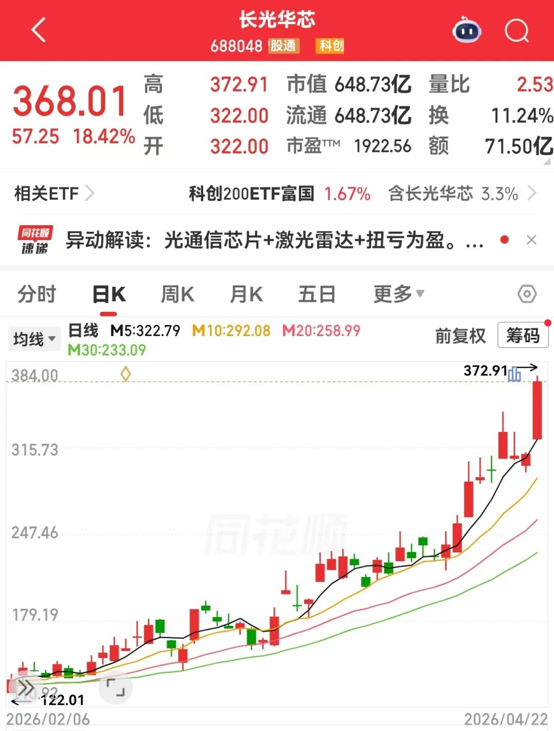 长光华芯则是光通信概念股。值得一提的是,该股已经完成十倍股之旅。2025年初,该股股价最低只有33.25元/股,今天盘中最高价接近373元/股,其间最大涨幅超过10倍。